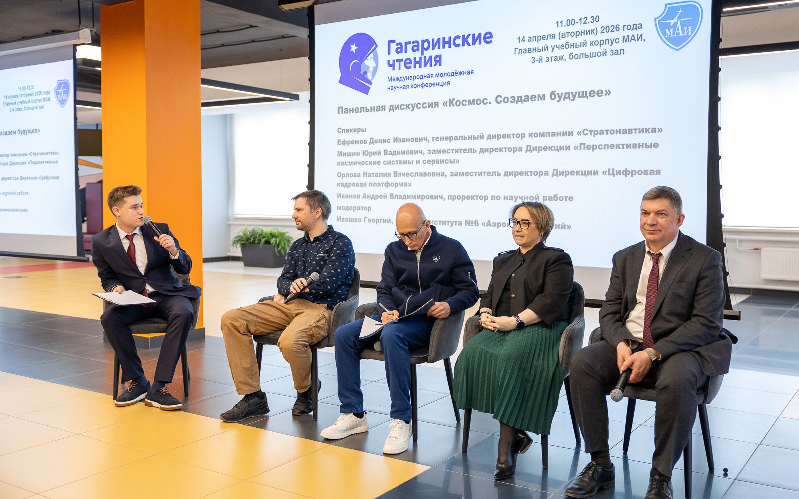Открыла конференцию панельная дискуссия «Космос. Создаём будущее». В мероприятии приняли участие генеральный директор компании «Стратонавтика» Денис Ефремов, проректор по научной работе МАИ Андрей Иванов, заместитель директора Дирекции «Цифровая кадровая платформа» МАИ Наталия Орлова и заместитель директора Дирекции «Перспективные космические системы и сервисы» МАИ Юрий Мишин. Модератором выступил студент института №6 «Аэрокосмический» МАИ, член студенческого научного общества университета Георгий Ивашко.